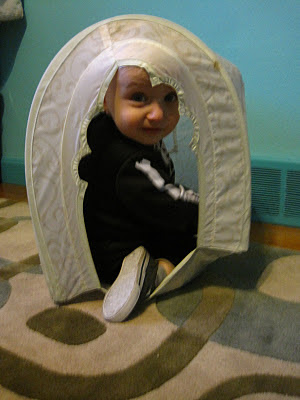 Needless to say, we are in full baby-proofing mode… outlet plugs, cupboard latches, and most importantly, electric cord wraps (and duct tape). He’s having a hard time exploring right now because I have to keep stopping him… from getting into everything! He did find Meow’s vacant house, though. I sent some toys in, and he stayed playing in his new fort for awhile.